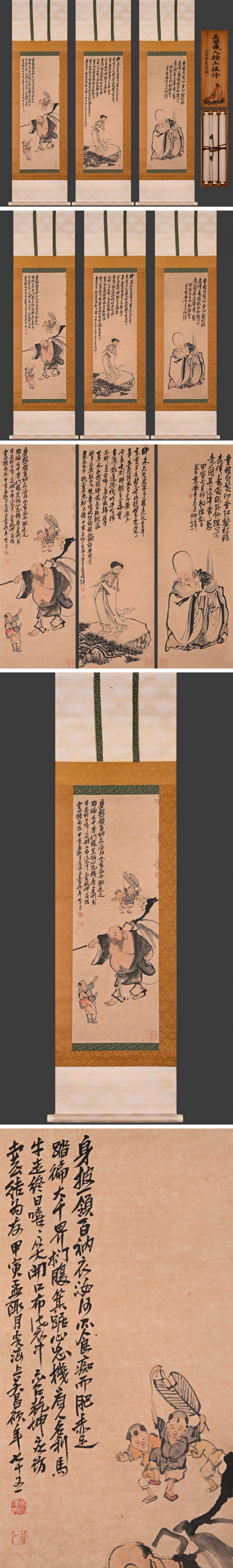 【清】中国時代画家「呉昌碩書」紙本「人物図・三対幅掛軸」巻き物 中国画 墨寶妙品 中国書画 古美味 古美術7L9-OG 收藏