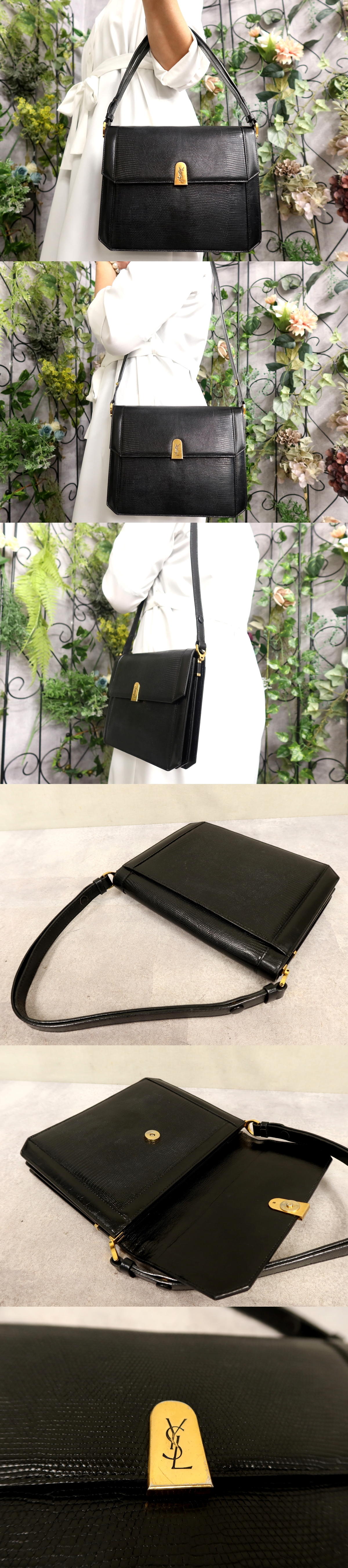 超美品●YSL Yves Saint-Laurent イヴ・サンローラン●リザード 本 トカゲ 革 カーフ レザー 本革●ショルダー バッグ●黒●G金具●Js61310 收藏