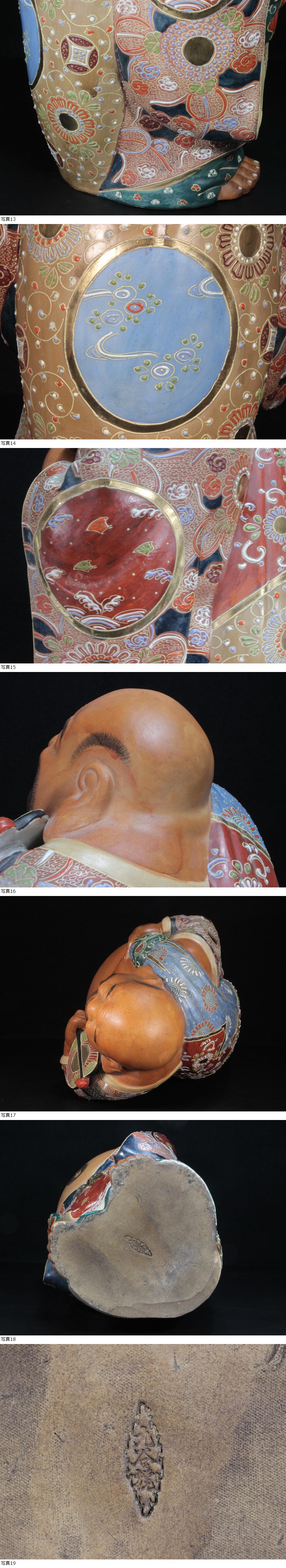 九谷焼 色絵 金彩 盛上 細密 花波千鳥紋 布袋像 七福神 置物 床飾 縁起物 高さ約44.5cm 重さ約5.6kg 古美術品 收藏