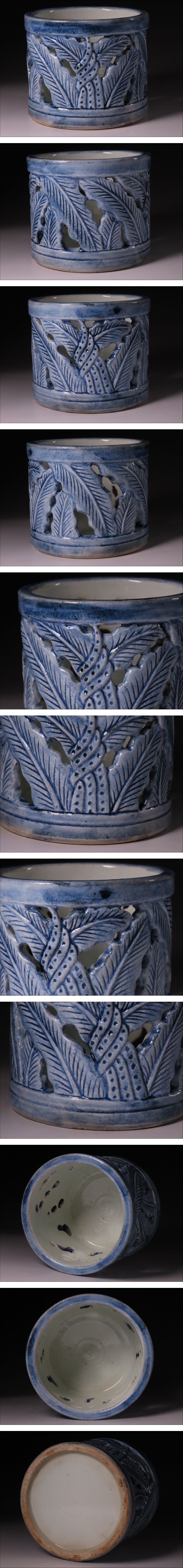 朝鮮美術 李朝 白磁染付透彫筆筒 瑠璃釉透彫筆筒 直径13.2cm 古染付 李氏朝鮮 文房具 書道具 韓国美術 | |||
