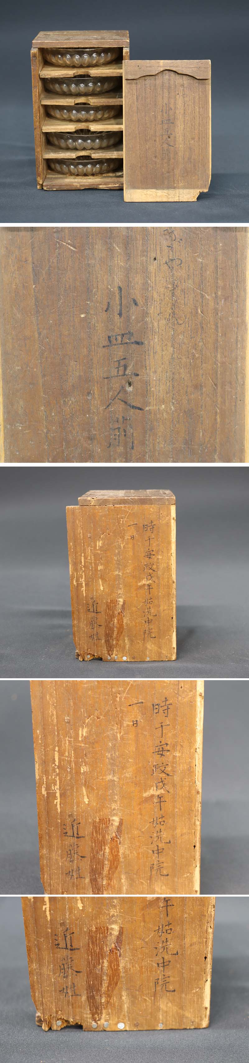 箱の側面に【安政戊午(安政5年、1858年)】、蓋表に【ぎやまん小皿 五人前】の墨書があります。