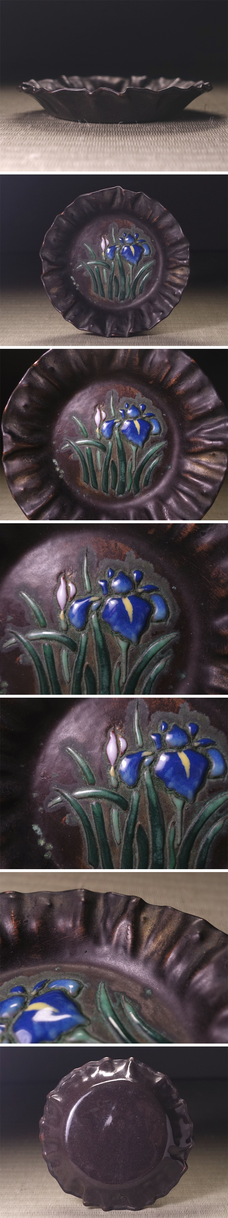 ∇花∇明治~大正頃 鎚起銅器 盛上七宝杜若文小皿 菓子皿 收藏