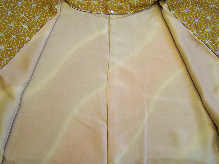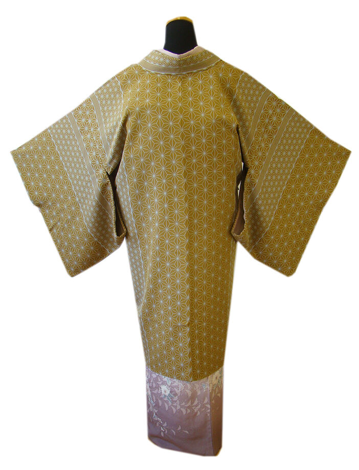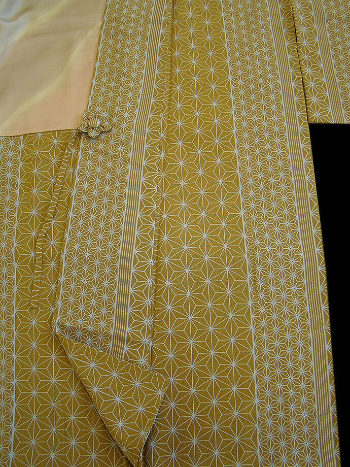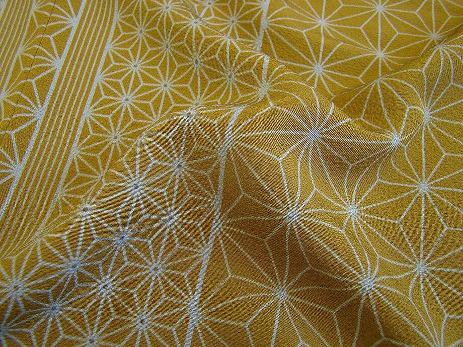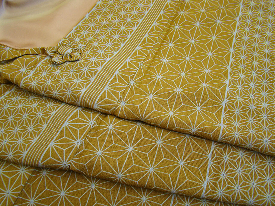 | 商品説明 | とてもしなやかで柔らかなさらりとした滑らかで着心地良い重めの極上ちりめん地の生地。 落ち着きある金茶色地に灰青色の麻の葉柄の染柄。 |