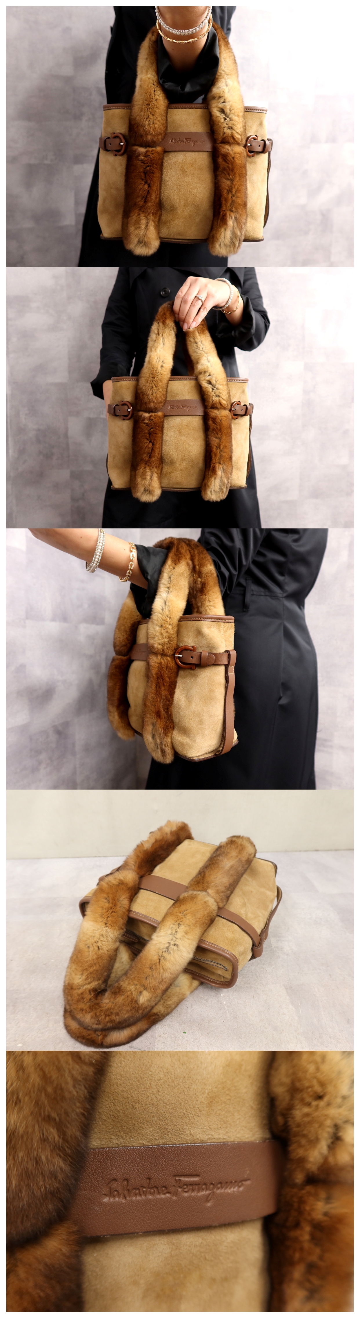 超美品●Salvatore Ferragamo フェラガモ●ガンチーニ●ファー スエード カーフ レザー 本革●ハンド バッグ●ブラウン系●SV金具●Js64336 收藏