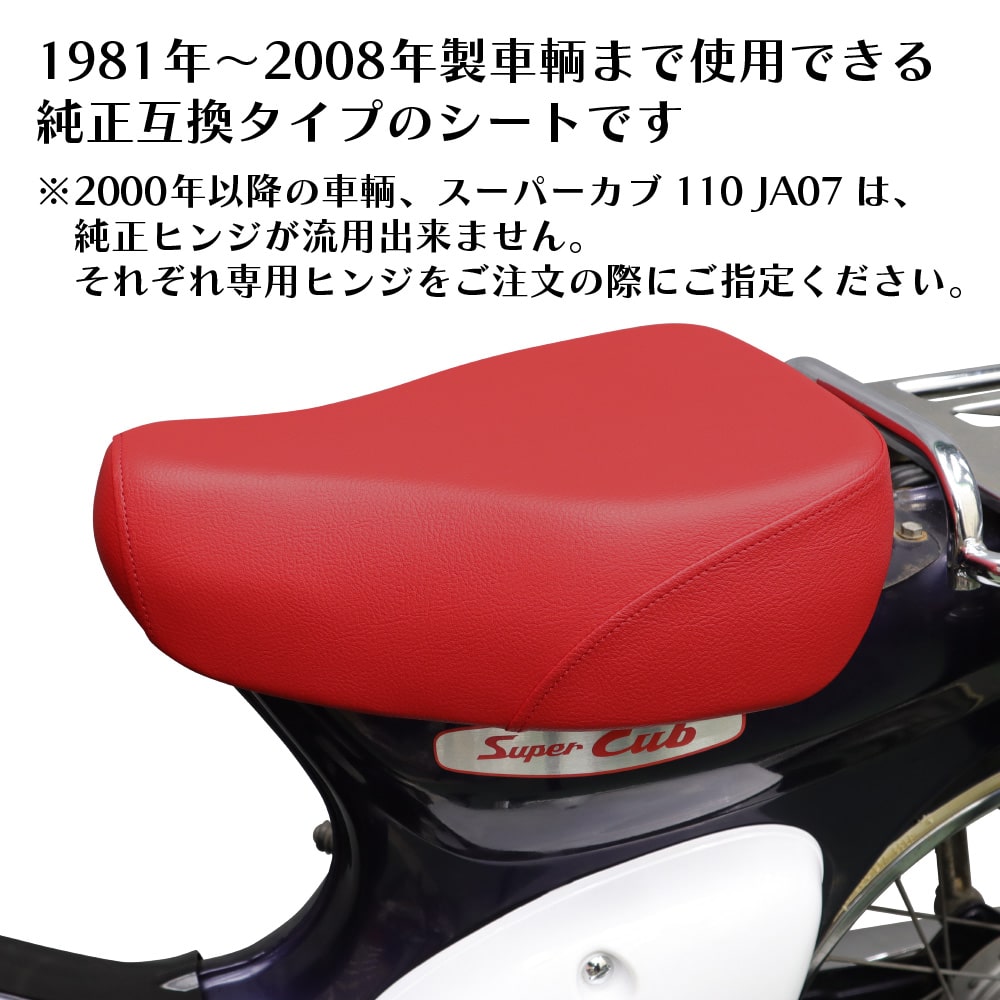 ■スーパーカブC50/C70/C90 AA01/HA02 ※1(80年以前・JA10/AA04以降は非適合) ■スーパーカブ110(JA07) ※2 ※1 2000年以降のモデルにお使いいただく場合、純正のヒンジが流用できませんので、シートヒンジを合わせてご購入ください。 ※2 スーパーカブ110(JA07型)にお使いいただく場合、純正のヒンジが流用できませんので、シートヒンジを合わせてご購入ください。 *ご注文時にプルダウンにてヒンジが必要・不必要かを選択してください。 *こちらのシートは出荷前に取り付け・外観を検品済です。 |