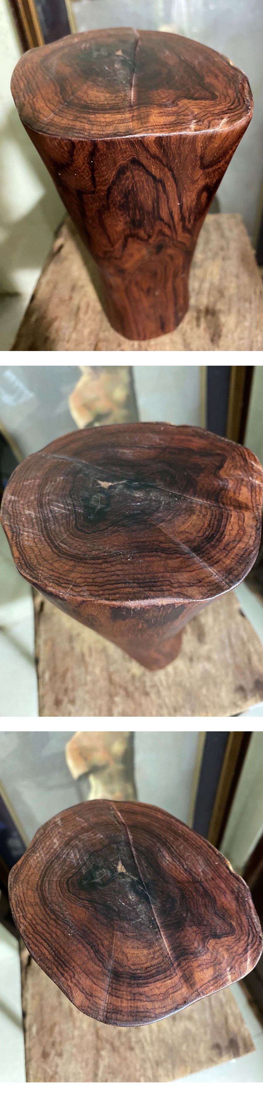 ■☆黄花梨を丸太にカットしてそのまま磨いた表面には、黄花梨の特有の、微細に波打つ深い陰影のある杢の輝きと、目のある風景の競演が、魅力的に現れているのがご覧になれます!