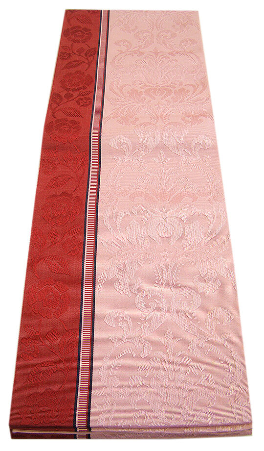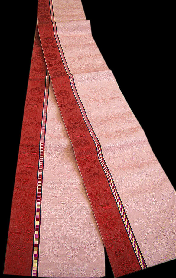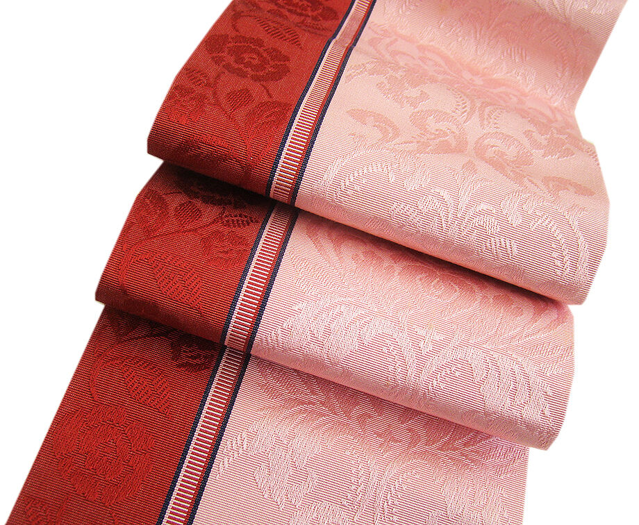 | 商品説明 | しなやかな手触りのしっかりとした博多織の四寸小袋帯。 珊瑚色地に赤色の太縞に紺色の細縞に花草柄の織柄。 裏地は珊瑚色の無地。 |