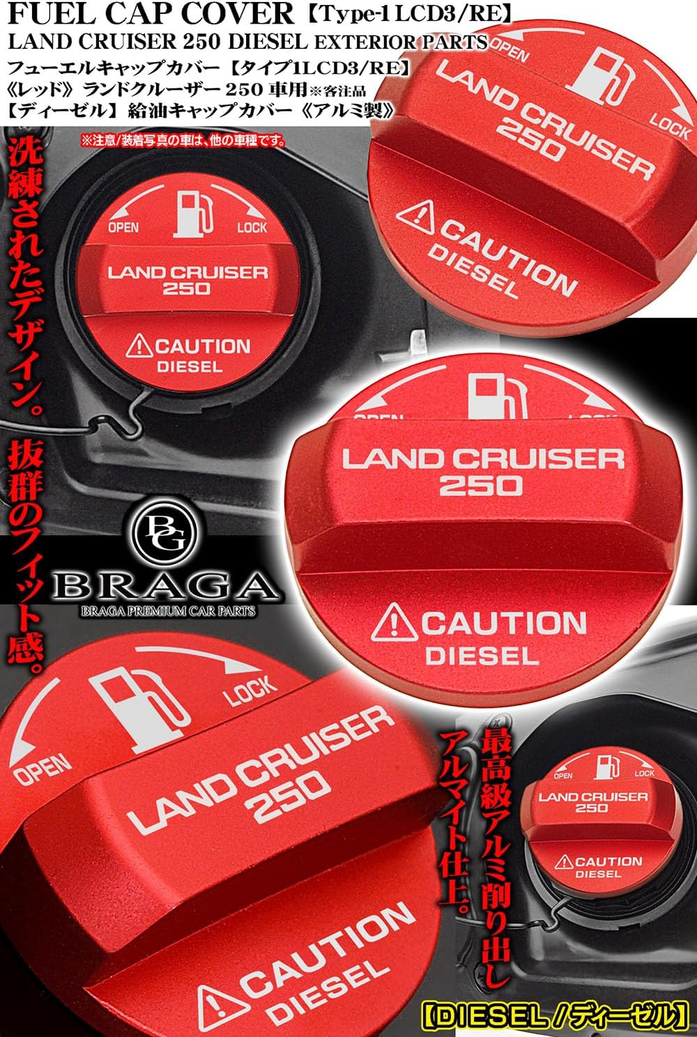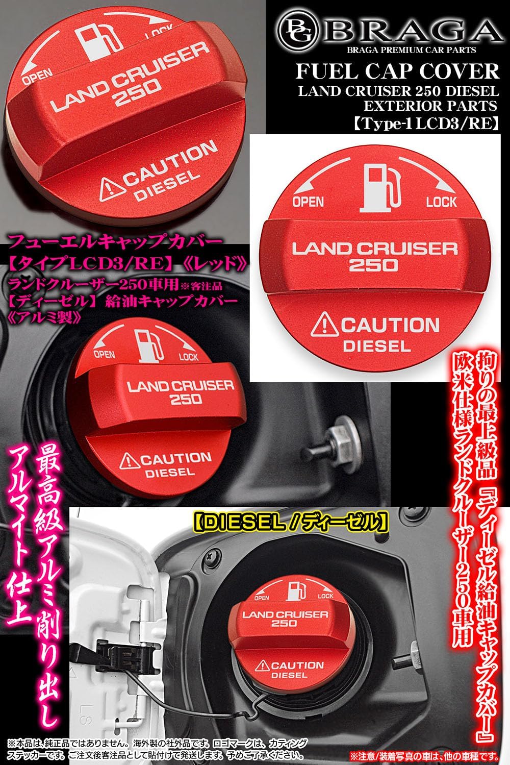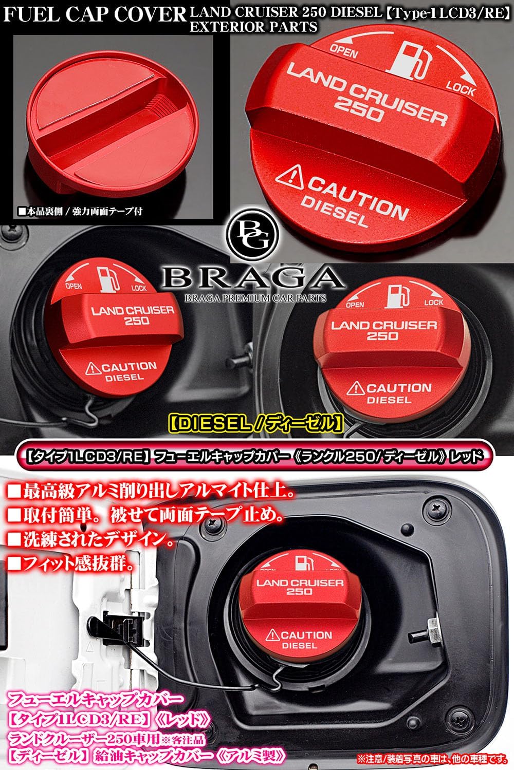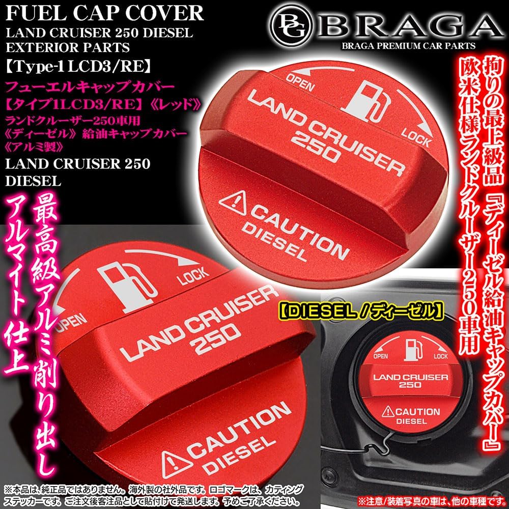 ランドクルーザー250/ディーゼル[タイプ1LCD3/RE] LAND CRUISER 250ステッカー/給油 フューエルキャップカバー/レッド/アルミ製/ブラガ 收藏