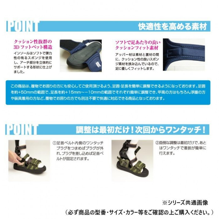 | 長さ調整自在のベルト採用により、ベルト伸ばし等の別注の必要性を大幅に軽減。装具着用の方やむくみのある方でも別注いらずで、そのまま簡単にご使用いただけます。 |