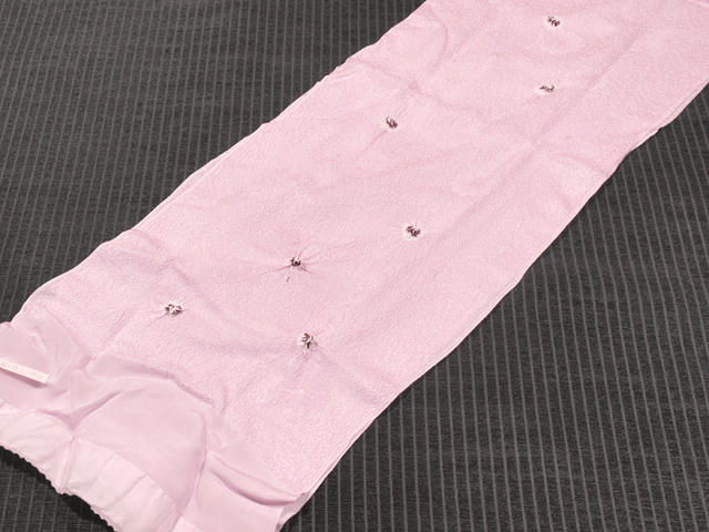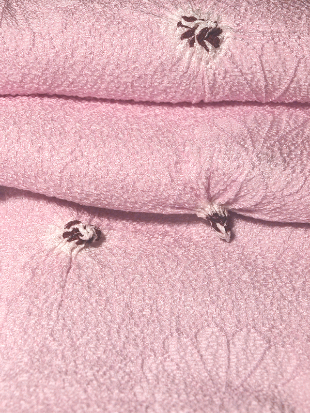 撫子(なでしこ)色の地に、菊と抽象的な地紋が織り出され、絞り染めで花の文様が施されている紋意匠縮緬の帯揚げです。着物専門販売店「やまと」さんで販売されたお品です。 未使用保管品です。しみやよごれ、褪色などのダメージもなく、新品同様です。 |