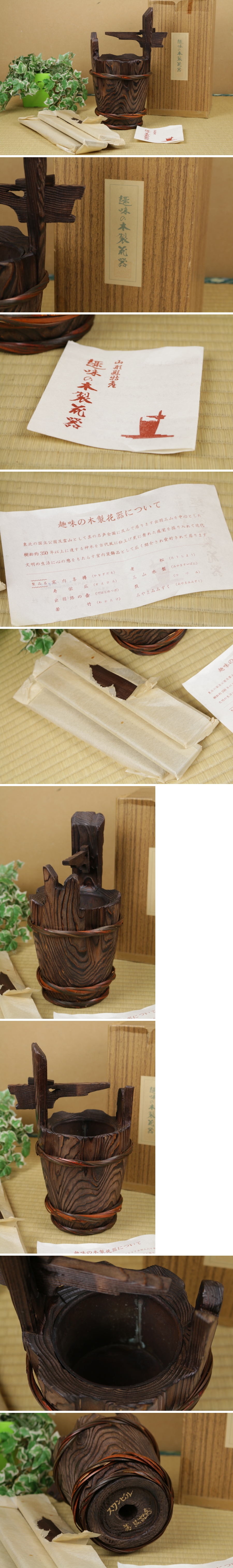 | 未使用 大山民芸社 木製花器 外寸:高300×横200×奥150mm 未使用品 多少の傷汚れがありますが未使用のものです。底面に記念品の記載あり。 出品の商品は背景のものを除く画像のもので全てです。 サイズは約です、多少の誤差はご容赦下さい。 | ||