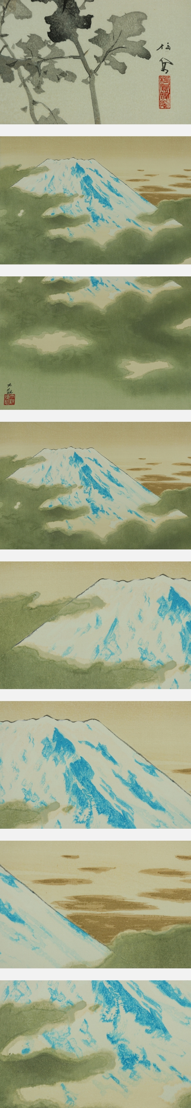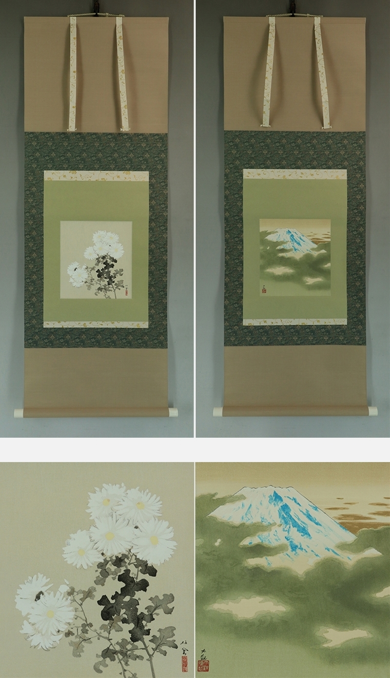 | №2210112【木版】横山大観・竹内栖鳳【富士・菊】◆紙本◆合箱◆掛軸 | |
