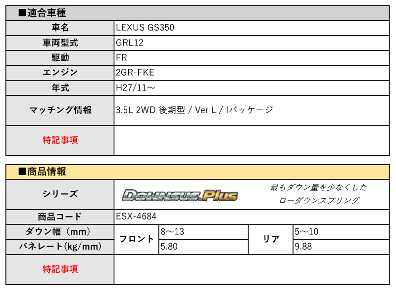 [エスペリア]GRL12 レクサスGS350_3.5L 2WD 後期型 / Ver L / Iパッケージ(H27/11~)用ダウンサスプラス[車検対応] 收藏
