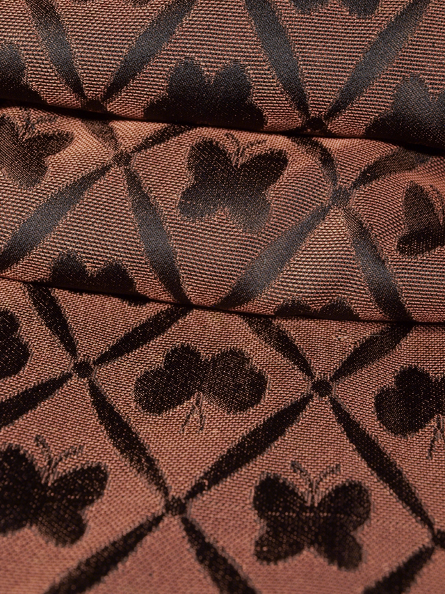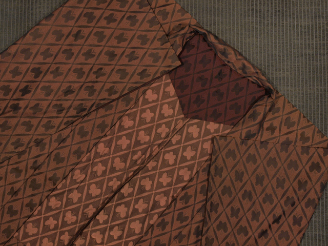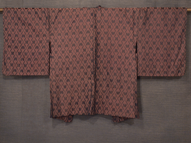 全体的な印象としては、やや淡い唐茶色といった感じの地に、蝶の配された襷(たすき)の地紋が織り出されている、二色風通紗の羽織です。単衣仕立てです。 シックなかわいらしさが感じられます。透け感があります。 ユーズド品と思われますが、目につくしみやよごれ、褪色などのダメージもなく、とてもきれいな状態です。 |