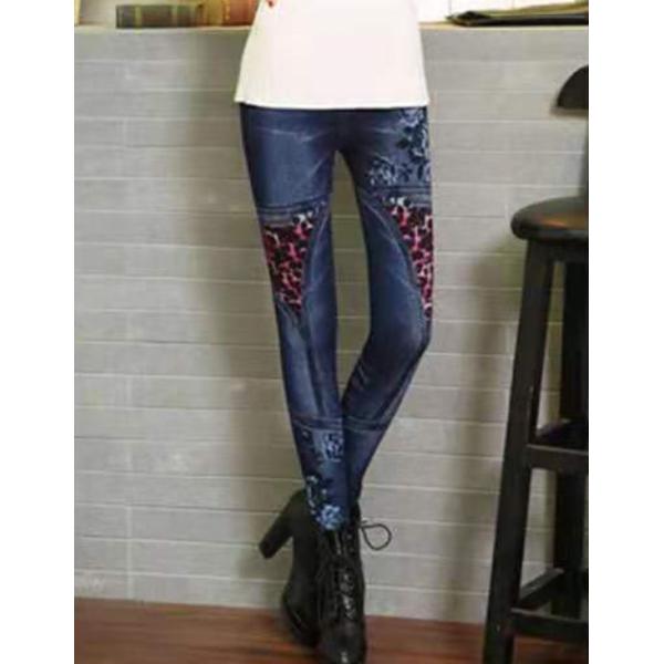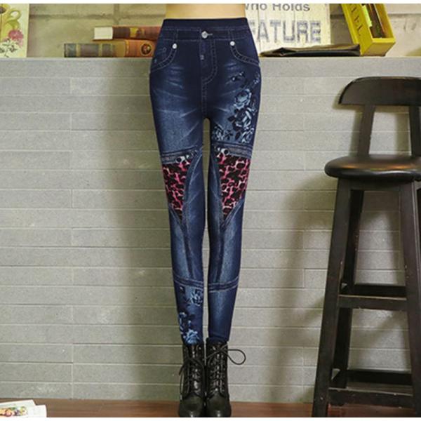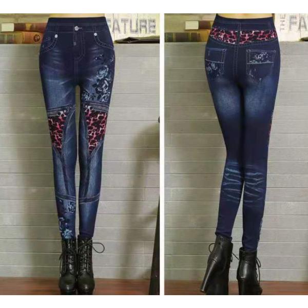 花と豹柄 デニム風 レギンス 伸縮 ストレッチ素材 收藏