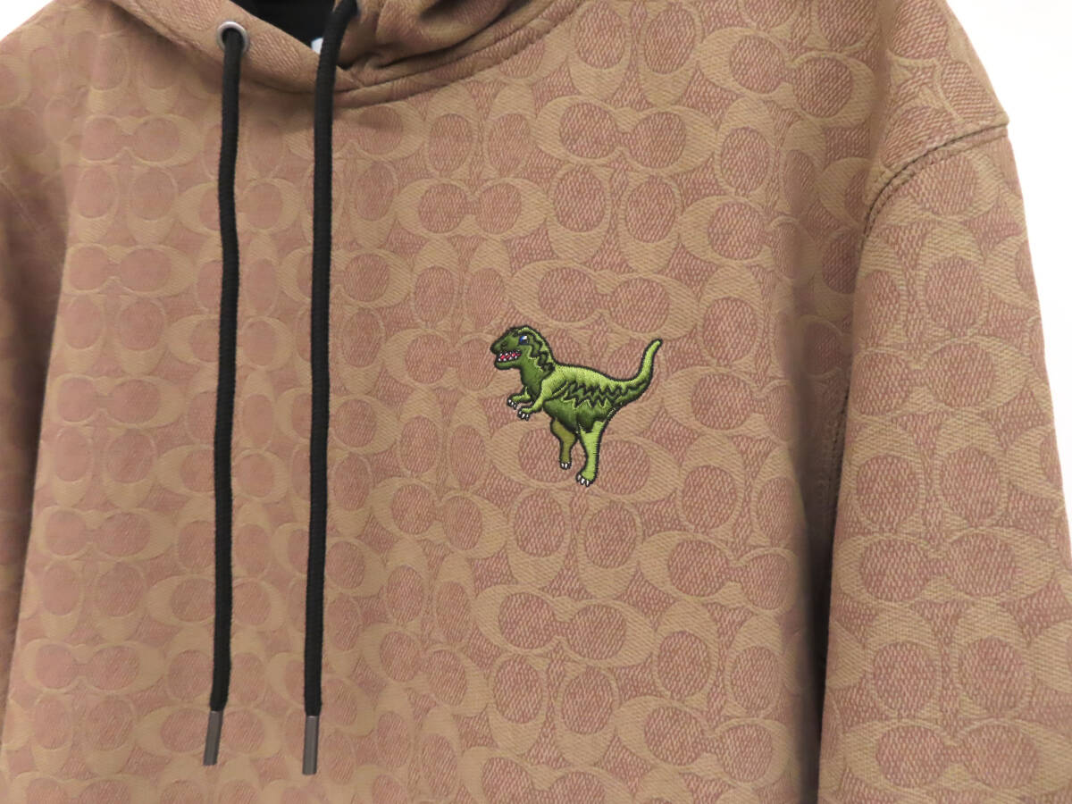 16063 美品 COACH コーチ レキシー 恐竜 刺繍 シグネチャー柄 プルオーバー スウェット パーカー オーバーサイズ S ベージュ系×黒 メンズ 收藏
