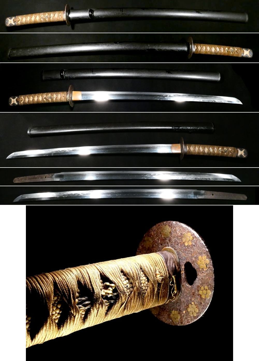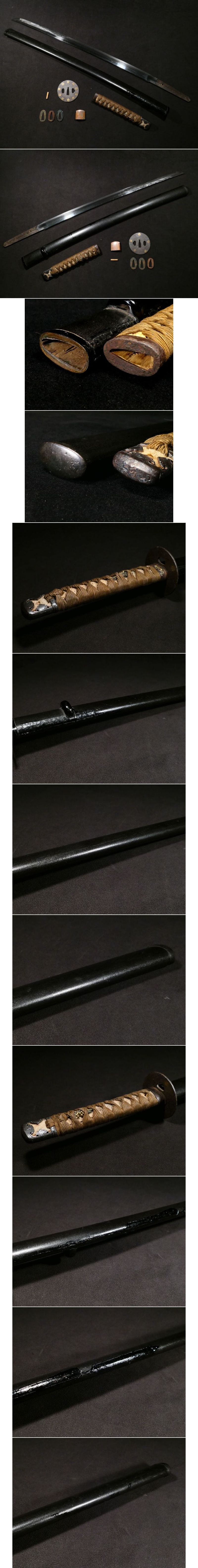 | 商品説明 | 材質:(縁・頭・鍔) 鉄地 (目貫) 赤銅地 見栄え良き金工金具付拵え入の大脇差のご紹介です。 乱れた刃文の見られる長さ 59cmと刀に近い長さの大脇差です。 現在は60cm以下は脇差に分類されておりますが 当時は刀として扱われていたと思われます。 拵には雰囲気の良い金工金具が装着されております。 中身は御覧の様にスレや小さな刃こぼれ、錆等ございますので 画像をよくご覧の上、ご納得のいく範囲にて入札にご参加ください。 鞘には、納めるのに問題はございませんが修繕跡が見られます。 その他、古い物ですので多少の時代傷みはご理解下さい。 詳しくは画像にてご判断下さい。 神経質な方は入札をご遠慮下さい。 ※当方は刀剣類に関しましては、あまり知識が明るくない為、 ご質問を頂きましても、あまり回答する事が出来ないと思います。 詳しい時代や銘、状態等に関しましては画像でご判断頂き、 納得の出来る範囲内で入札に御参加頂ける様、よろしくお願いします。 |