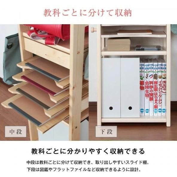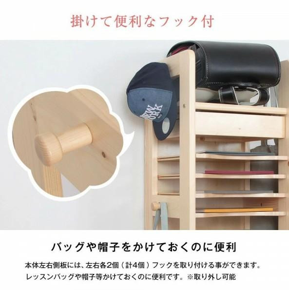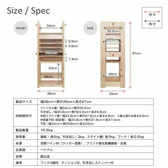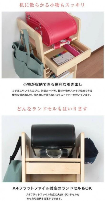 | 仕様 | 組立品 フック4個付 クッション付 【耐荷重】 棚板:各5kg 引き出し:3kg スライド棚:各3kg フック:各0.5kg 【収納部内部】 ランドセル棚:幅34×奥行32.5cm 引き出し:幅30.8×奥行24.5×高さ5.6cm 中段スライド棚:幅33.8×奥行27.5×高さ4.8cm(※最上部のみ高さ5.9cm) 中段最下段(固定棚):幅33.8×奥行27.5×高さ7.4cm 下段:幅34×奥行29×高さ33cm |