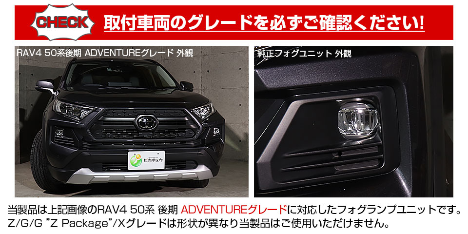 [必ずお読みください]◆本製品は50系RAV4のADVENTUREグレード対応です。Z/G/G"Z Package"/Xグレードはフォグユニットの形状が異なるため装着できません。
