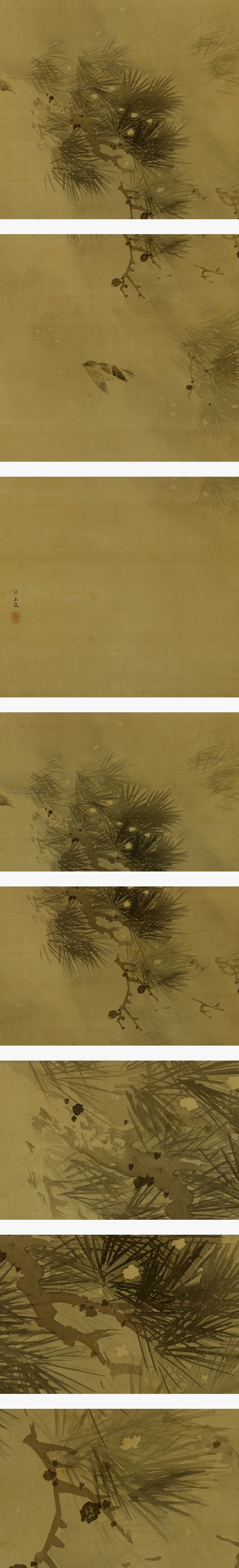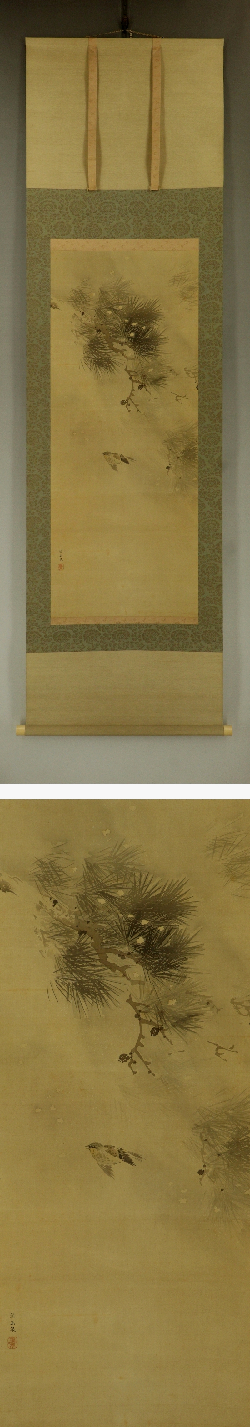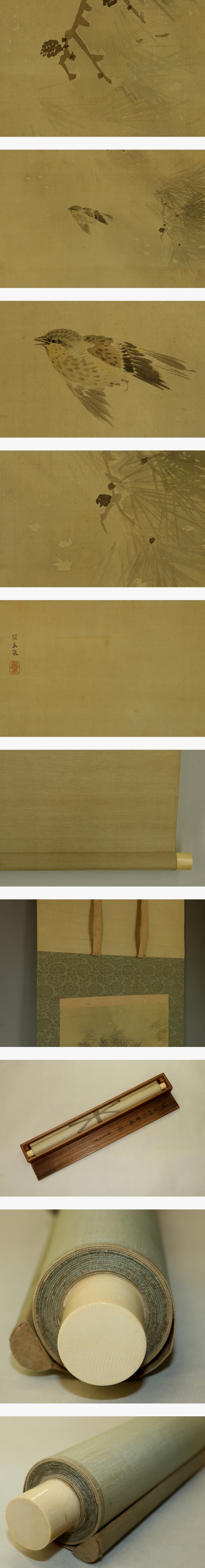 | №2503116【模写】望月玉泉【吹雪松樹野鳥之図】◆絹本◆合箱◆掛軸 | |