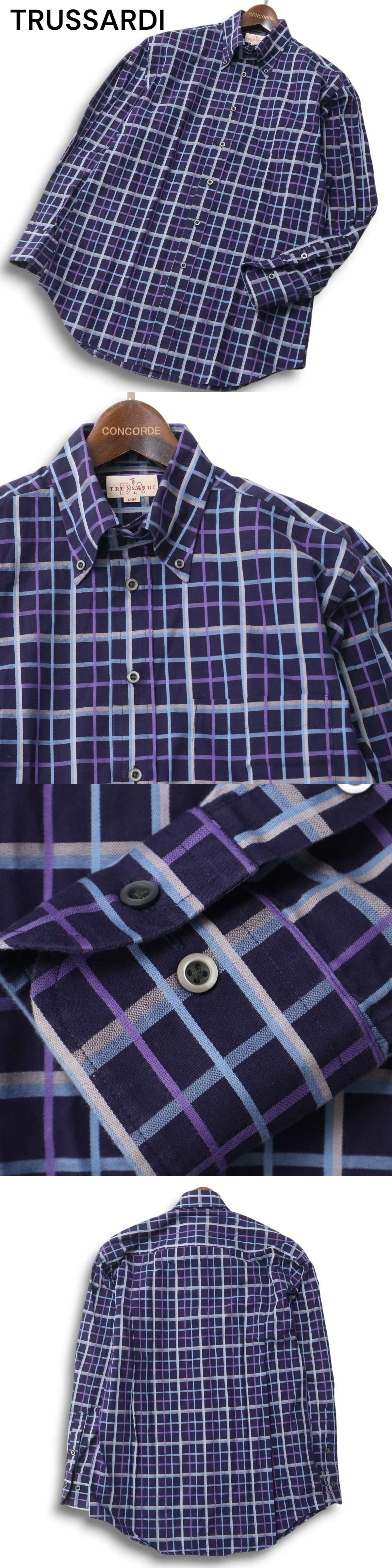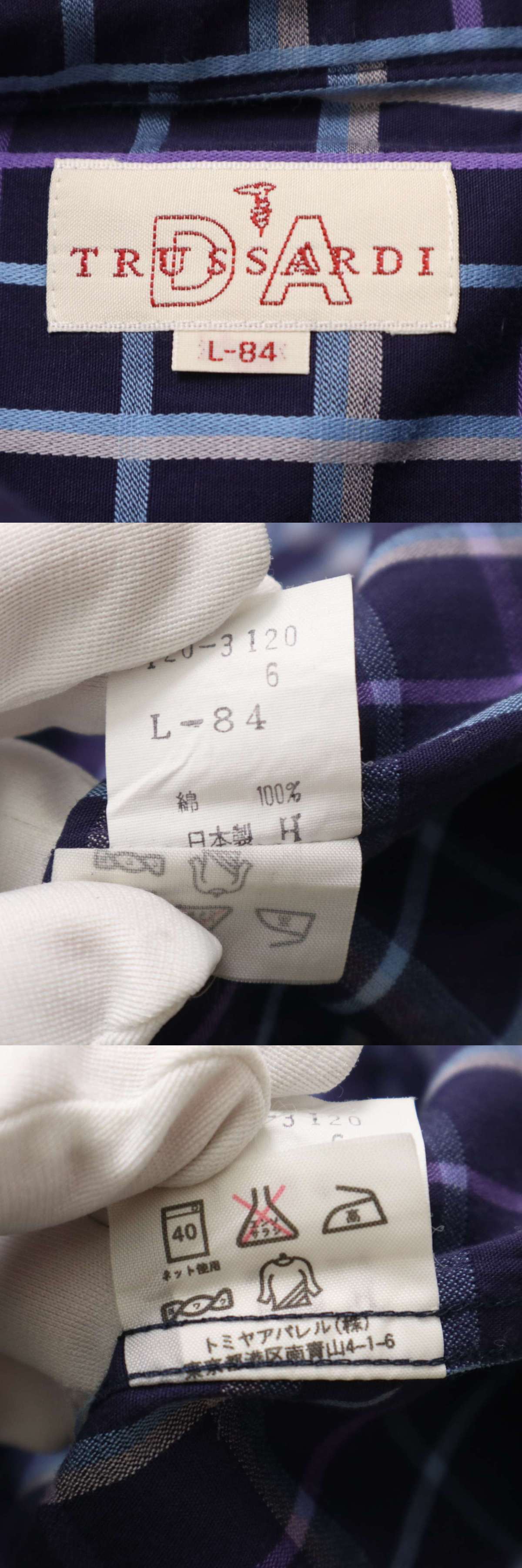 TRUSSARDI トラサルディ 通年★ 長袖 ボタンダウン チェック シャツ Sz.L-84 メンズ 紺 ネイビー 日本製 收藏