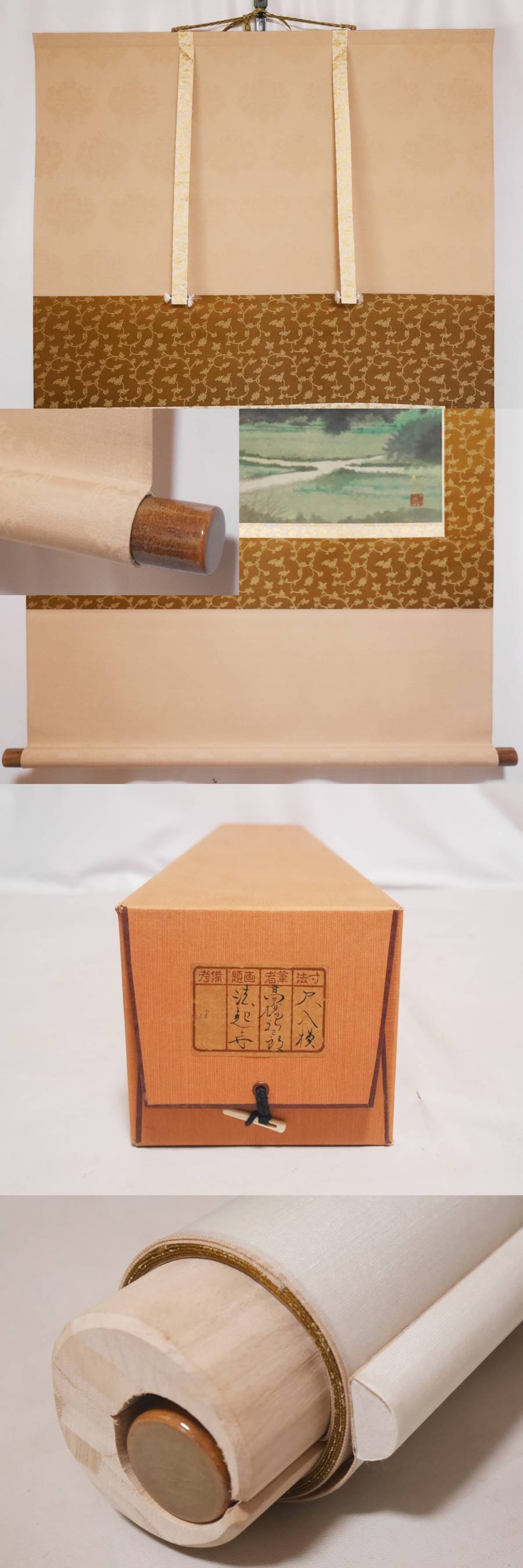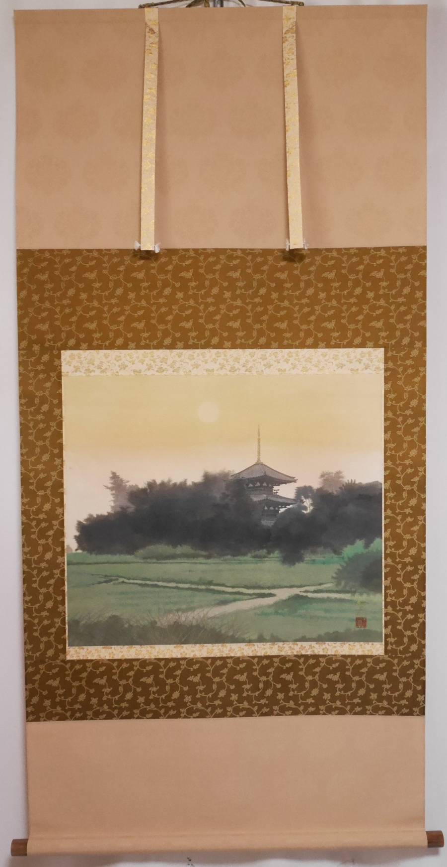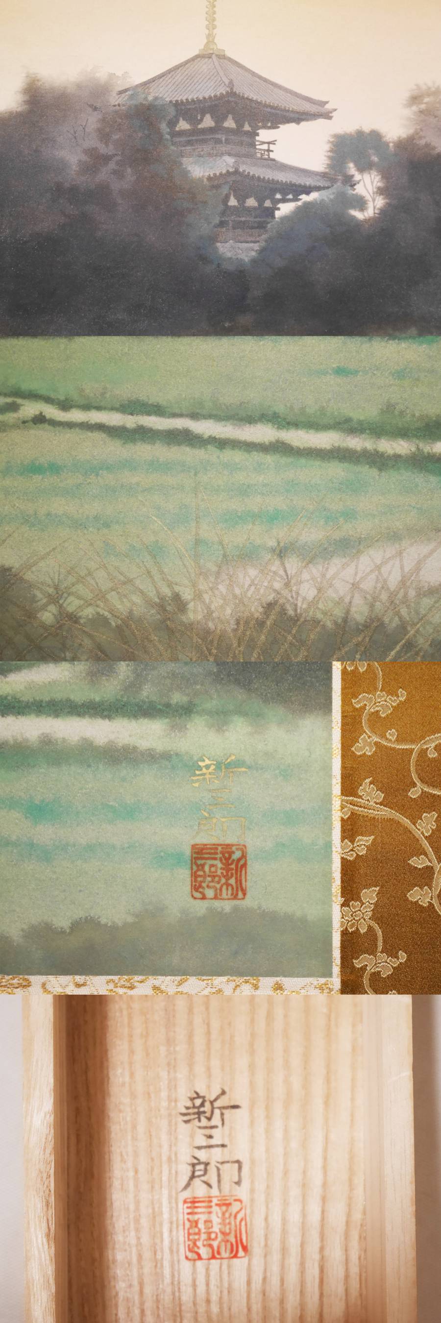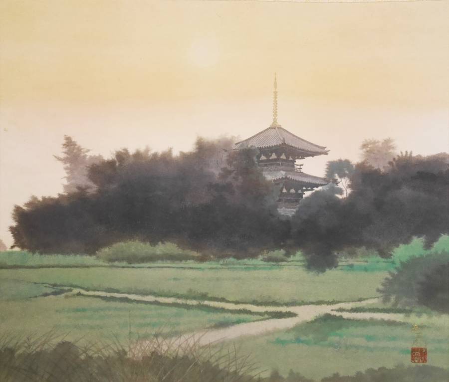 【真作】良品★太巻二重箱入【法起寺】日本画家 高橋新三郎◆本紙紙本 肉筆 共箱付 日本画 風景 山水 掛軸 收藏