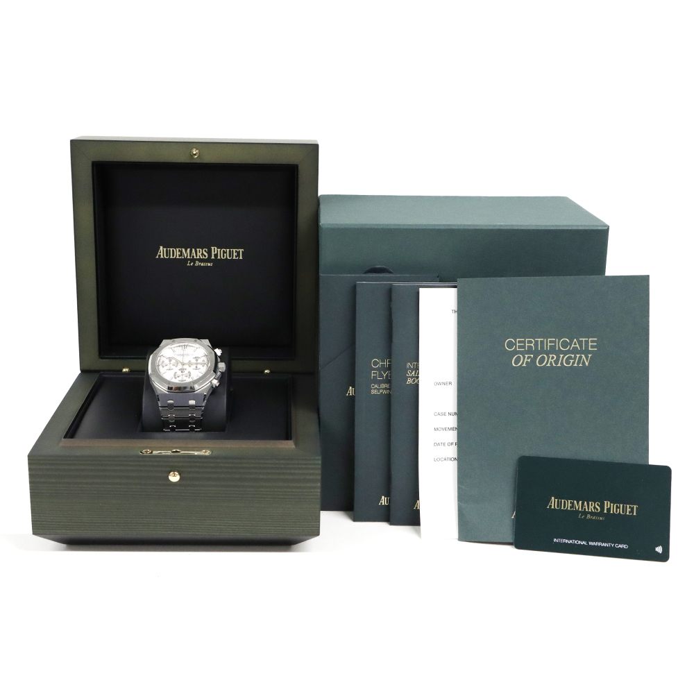 こちらはロイヤルオーク クロノグラフ 26240ST.OO.1320ST.03です。2022年ロイヤルオーク・クロノグラフ50周年記念として発表された新作モデル。完全自社製Cal.4401を搭載し、70時間のパワーリザーブを実現。測定精度も向上し操作しやすいジャンピングデイトを備え、一体型クロノグラフのフライバック機能、垂直クラッチシステム、ゼロリセットメカニズムを装備。ステンレスのケースの、ダイヤルにはシルバーカラーの「グランド・タペストリー」模様を採用し、12時位置の〔AP〕ロゴの廃止。また、スティールやチタンのロイヤル オークとしては初めて、より薄いコマを採用したブレスレットデザインへとアップデートされています。ケースバックのサファイアケースバックからは、AUDEMARS PIGUETのシグネチャーが彫られたロゴやケース色と同色に揃えられた特性の50周年のローターをお楽しみいただけます。世界三大時計ブランドが誇る人気のロイヤルオーク・クロノグラフは所有者を格別な気持ちにさせてくれるステータス性が高い極上の一本です。