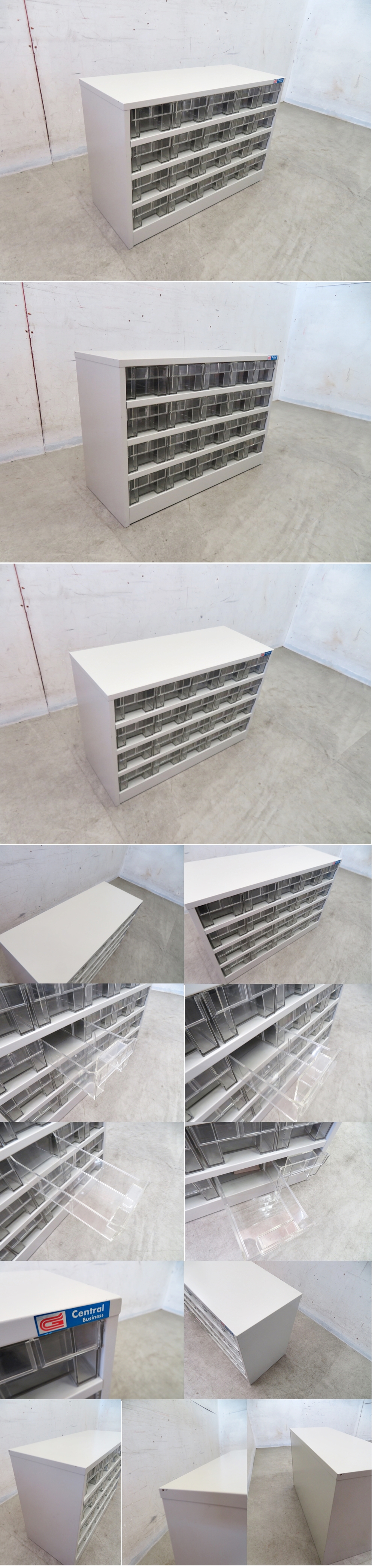 「Central Business」ブランドのパーツケースです。 スチールのしっかりとした本体に、透明の引き出しが多数備わっており、 小物やパーツ、工具の部品などを整理収納するために設計された実用的なアイテムです。 前面のクリア引き出しは中身が一目で分かるため、ラベルを貼ればさらに効率的に管理できます。 工場や作業場、オフィスの備品整理などプロフェッショナルな現場でも活躍しますが、 ご家庭での趣味の部品収納やDIY用品の整理にもぴったりです。 ホワイトの本体カラーは清潔感があり、無骨になりすぎずインテリア性も損なわないのが魅力です。 横幅が広めで収納力がありながら、奥行きは比較的コンパクトなので、 限られたスペースにも収まりやすい設計となっています。 大変おすすめですのでこの機会にぜひ!!! コンディション:中古の為、写真の様な傷、汚れ、仕切り板欠品などありますが、その他は大きなダメージはなく美品です。 サイズ横64センチ奥行き26.5センチ高さ44センチです。