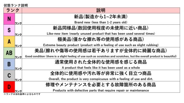 | 【必読】取引注意事項 ○商品の状態やランクに関しましては当店基準のランク付けを致しております。 必ずランク表と商品の状態ランクをご確認いただきご入札お願いします。神経質な方や中古品に完璧を求められる方はご遠慮下さい。 ○顕著な汚れや傷みなどの瑕疵は優先して必ず撮影しておりますが、掲載上限の都合上、微小な部分については撮影しきれていない場合がございますので何卒ご容赦ください。 ○過度な臭いは記載していますが、ユーズド品の特性上過敏に気になる方は購入をお控えください。 〇事前に検品を行い判断できる物は撮影および記載をしていますが、ヴィンテージの特性上、その過程においてメンテナンス(修理・補色・補修)が施されている可能性は否定できません。発売当時のオリジナル状態の確約は行えませんので予めご了承ください。(※正規品であっても社外メンテナンスがあるお品物はシャネルでの修理ができない可能性もございます) ○付属品はある物をそのままお付けしております。おまけ程度にご理解いただき、状態につきましての記載は省略させていただいております。 〇当方の出品商品は、AACD(日本自首流通管理協会)会員企業の大手業者オークションから仕入れたお品物です。主催企業により鑑定された品物をさらに当方が1点ずつ入念に鑑定した物を出品しております。お品物は断言して正規品であることをお約束いたします。 ○ご購入後の返品、交換、クレームはお受けできませんので、ご質問や確認事項あれば必ず購入前にお願いします。 ○ご購入いただいたお客様は、上記注意事項全てをお読みいただき、同意いただいたものと判断させていただきます。 | |||