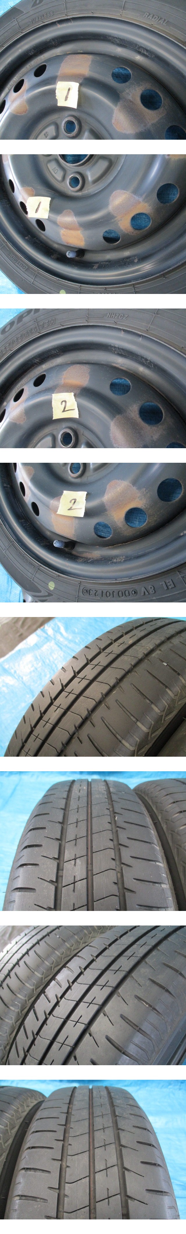 ※下記情報をよくご確認いただいたうえで入札してください。 弊社では「まとめて取引」への対応は行なっておりません。 同梱をご希望の場合はご入札前にご質問下さい。 同梱可能な商品の場合は対応いたします。 また、質問や連絡等なくまとめて購入を選択・決済をされた場合は別途追加の送料をいただくことがあります。 営業日15時までの入金確認で即日発送できます。 日曜日、第2・第4土曜日、祝祭日はお休みを頂いてます。 ■取り外し車両 ●認定型式=DBA-L575S(ダイハツ ムーヴ・コンテ) ●年式=2010/05 ●車体番号=0090*** ●走行距離=114,677km ●エンジン型式=KF-VE(NA車) ●ミッション=CVT ●型式指定/類別区分=16138/0019 ●グレード=Xスペシャル ●駆動=2WD ■詳細 ・上記車両からの取り外しです。 ・タイヤ付ホイール2本セットの出品です。 ●タイヤ サイズ 155/65R14 メーカー/銘柄 BRIDGESTONE(ブリヂストン) Ecopia(エコピア) NH200C 製造年週 2本とも2023年01週 残溝 2本ともに7分山程度 ●ホイール L575コンテ 純正スチール(ブラック) サイズ 14×4.5J ハブ径54mm 4H PCD100 ■状態 ●タイヤ トレッド面に少しヒビが発生しています。画像でご確認ください。使用は可能です。 パンク修理はありません。 ●ホイール 2本ともにホイールキャップ跡あります。 リムの曲がりや変形、その他損傷ありません。 ・気持ち良くお使い頂く為、出来る限りの掃除はしています。 ※当方で自動車部品を出品していますので、よろしければ下記のURLよりご覧ください。 team818ys出品リスト⇒https://auctions.yahoo.co.jp/seller/team818ys ■在庫管理番号 2500564-1 ■送料 (元払いのみの対応)運送会社の選択はできません。 [ 北海道 ] 2730円 (北海道) [ 東北 ] 2310円 (青森、岩手、秋田、山形、宮城、福島) [ 関東 ] 2100円 (茨城、栃木、群馬、埼玉、千葉、東京、神奈川、山梨、新潟、長野) [ 中部 ] 2000円 (静岡、愛知、岐阜、三重、富山、石川、福井) [ 関西 ] 1890円 (滋賀、京都、大阪、兵庫、奈良、和歌山) [ 中国 ] 1890円 (鳥取、岡山、島根、広島、山口) [ 四国 ] 1790円 (香川、徳島、愛媛、高知) [ 九州 ] 1890円 (福岡、佐賀、長崎、熊本、大分、宮崎、鹿児島) 沖縄県・離島の方は送料をお問合せ下さい。 最後までご覧頂き有難うございました。ご検討宜しくお願い致します。 | ||||