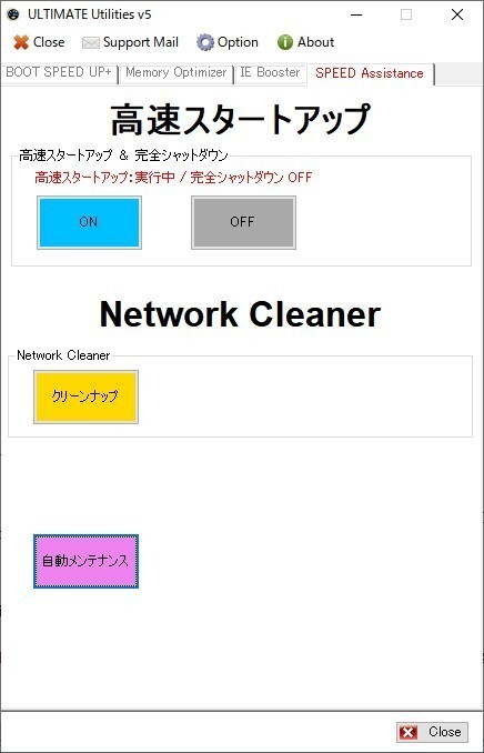 かんたん機能説明 1. Windows高速化 ボタン1つでWindowsの起動と動作を高速化!サクサク操作になります。 2. 究極メモリー解放 使用中、未使用、不使用メモリを究極解放することによりサクサク操作になります。 世界No1の解放を体験でき、あまりの解放に笑いますよ。 3. SSD余寿命延長 SSDの欠点である削除した領域の再利用ができないのを解決してSSDの余寿命延長、高速化処理の二次効果です。 4. 高速スタートアップ Windows 11、Windows 10、Windows8 標準機能の高速スタートアップを ON / OFFできる機能 5. 完全シャットダウン Windows 11、Windows 10、Windows8 標準機能の完全シャットダウンを ON / OFFできる機能 6. Network Cleaner(全ブラウザ対応) OSレベルのネットワーク根幹を安全にクリーンナップ、何か引っかかるなと思うネットワーク処理を高速化 7. IE Booster (Internet Explorer 超高速化) 遅いまたは重くなって使い物にならない Internet Explorer を超高速化する機能 8. Microsoft Edge Booster(キャッシュ切替、高速化) 通常ではできないディスクキャッシュ保存先の変更機能 & Edgeを超高速化する機能 |