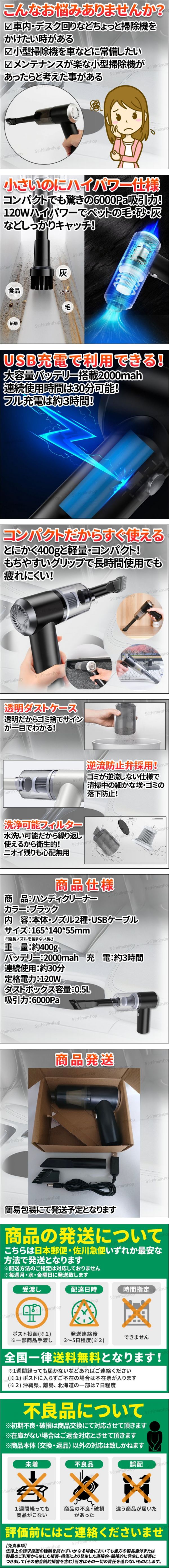 | ◎商品:ハンディクリーナー ◎カラー:ブラック ◎サイズ:165*140*55mm ※延長ノズルを含まず ◎重量:約400g ◎バッテリー:2000mah ◎充電:約3時間 ◎連続使用:約30分 ◎定格電力:120W ◎ダストボックス容量:0.5L ◎吸引力:6000Pa ◎内容:本体・ノズル2種・USBケーブル | ||
