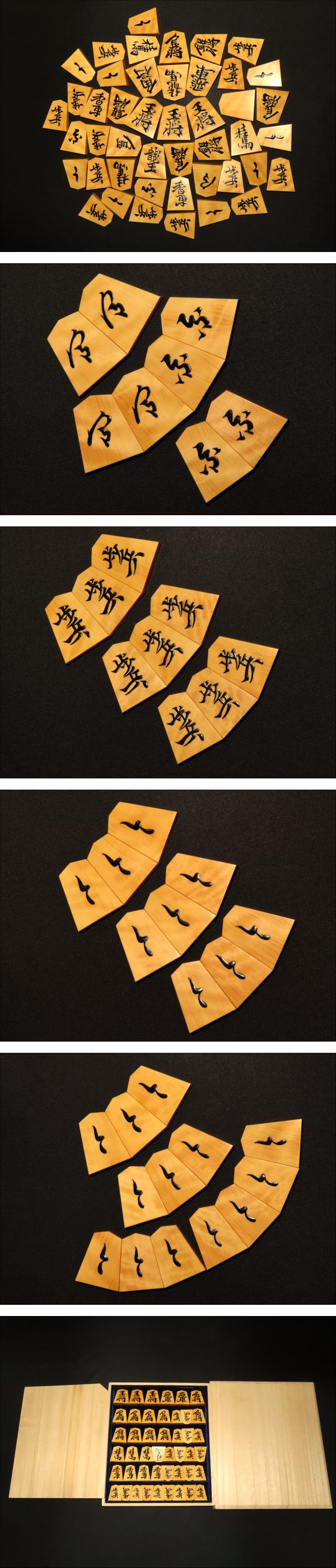 木地は御蔵島黄楊虎斑。ご覧のとおり非常に味のよい木地です。全ての駒の表裏をUPいたしましたので是非ご覧ください。