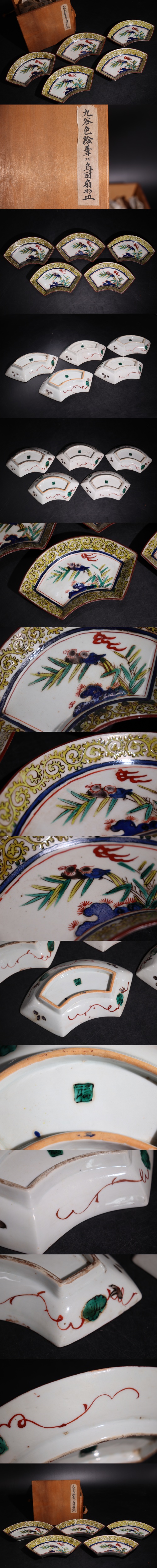 | 時代 九谷 色絵 鳥図 扇型 皿 五客 木箱付 / 角福 茶器 銘々皿 煎茶道具 煎茶飾 .G3138 |