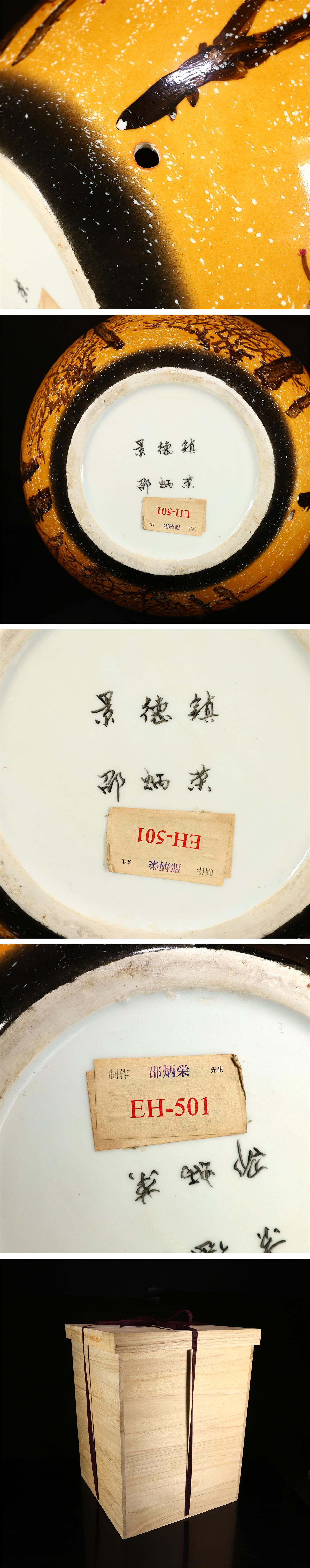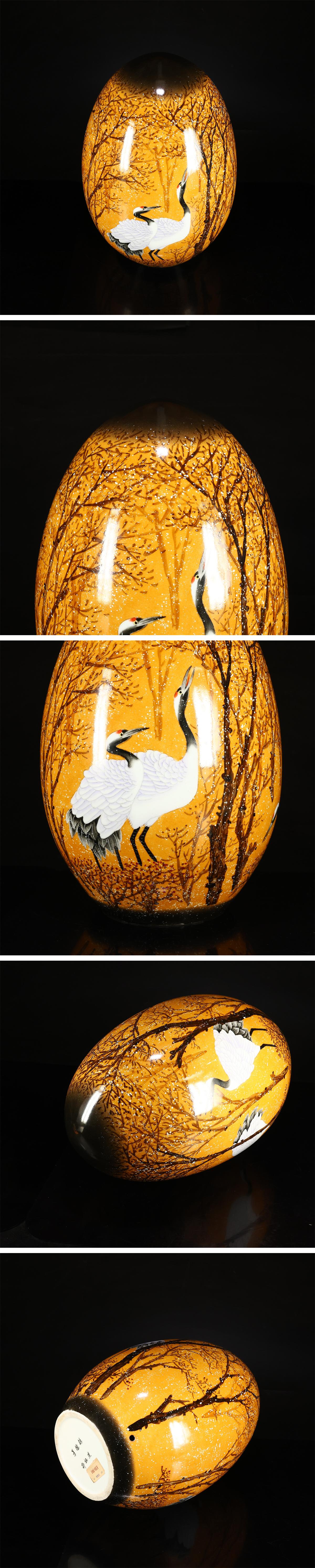 【吉】CN883 中国芸術家 景徳鎮名工 【卲炳栄 作】 黄釉山水鶴文 玉子形 置物 大花瓶 高45㎝ 径30.5㎝/本物保証 美品N! 收藏