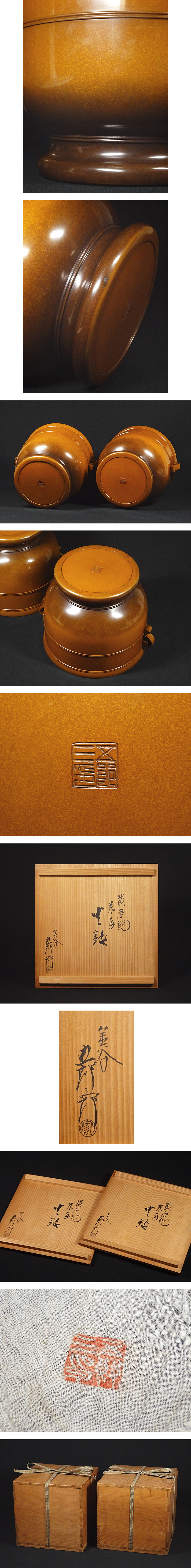 慶應◆【11代金谷五郎三郎】造 黄唐銅巻耳火鉢一対 共箱 未使用・状態良好! 煎茶道具 收藏