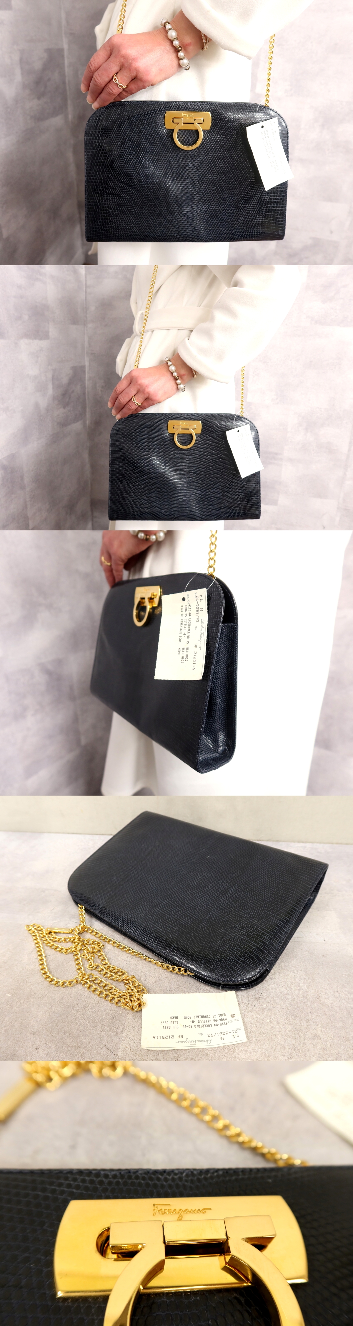 ●超美品●Salvatore Ferragamo フェラガモ●ガンチーニ●リザード 型押し レザー 本革●チェーン ショルダー バッグ●ネイビー●Js64198 收藏