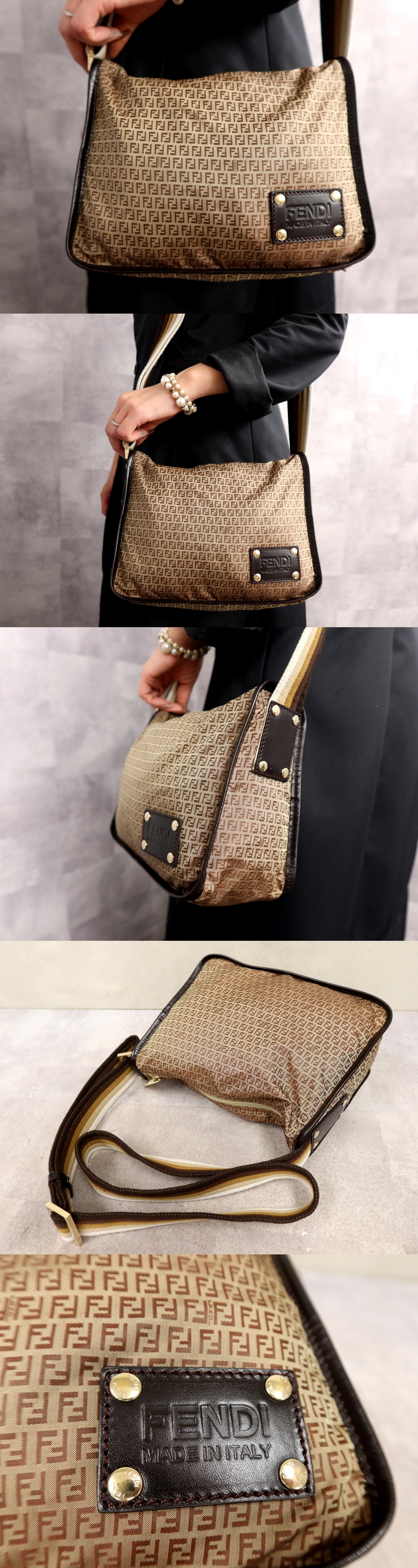 ●超美品●FENDI フェンディ●ズッキーノ●ナイロン カーフ レザー 本革●ショルダー バッグ●ベージュ ダークブラウン●G金具●Js64261 收藏