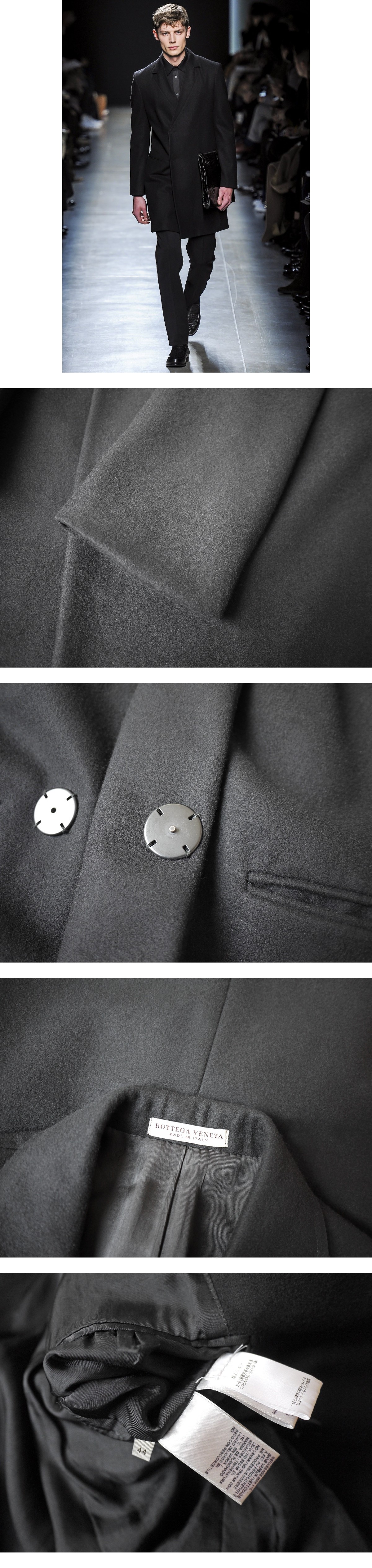ボッテガヴェネタのカシミアブレンドウールメルトンチェスターコートでございます。正規路面店にて新品購入いたしました100%本物でございます。ランウェイと同型モデルでございます。