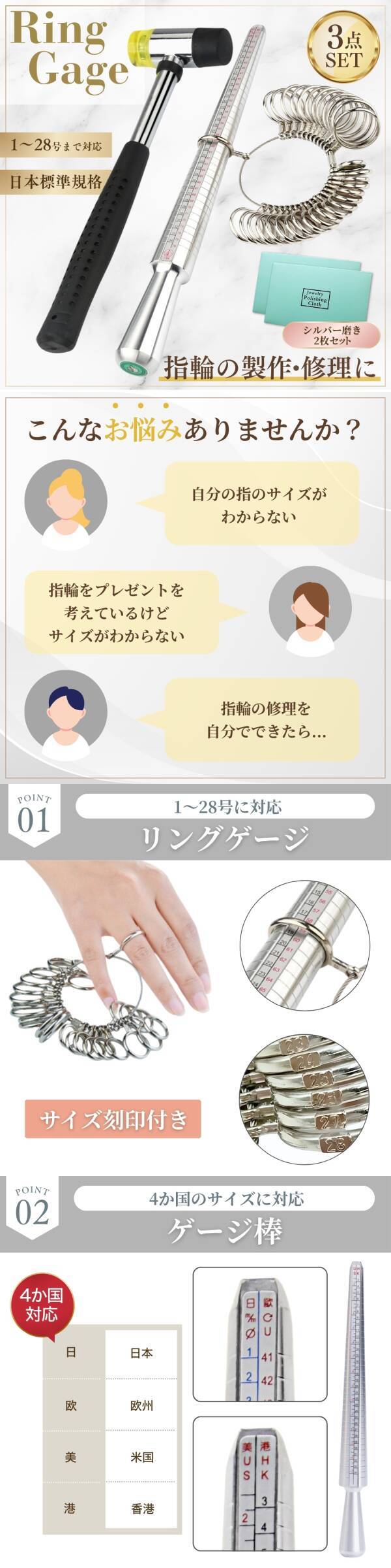 リングゲージ リングゲージ棒 3点セット 指輪 サイズ 計測 測定 日本規格 ハンドメイド DIY ハンマー シルバー 磨き クロス 指 修理 自作 收藏
