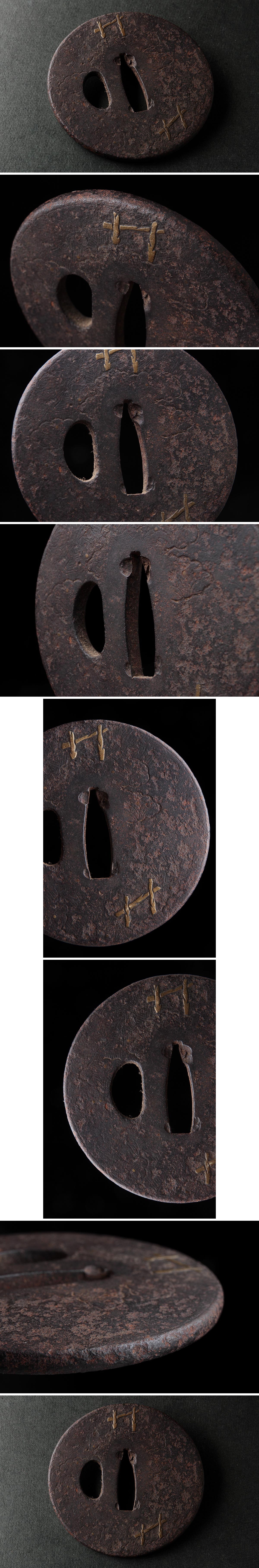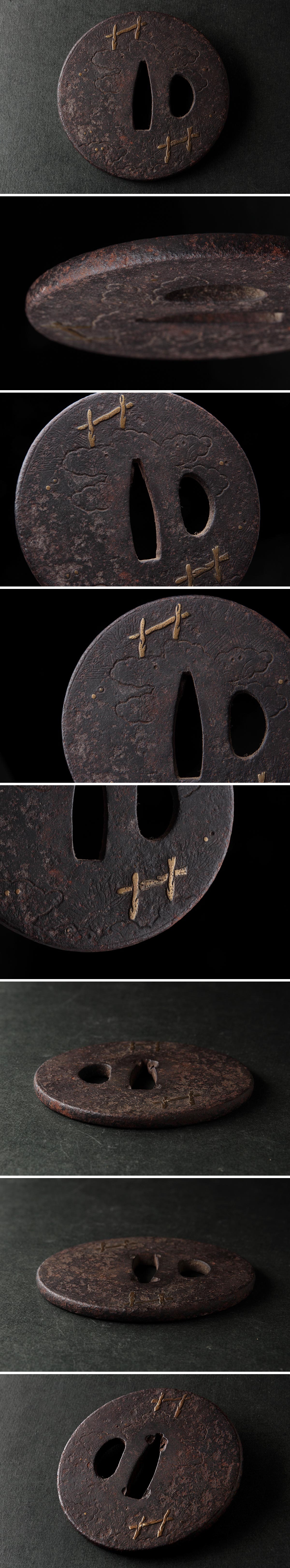 | ◆ 時代刀装具 無銘 鉄地 真鍮嵌 松樹図 丸形鍔 径7.1cm・鉄象嵌鍔・鉄鐔・古鍔 武具 古金工 古美術 小道具 ◆