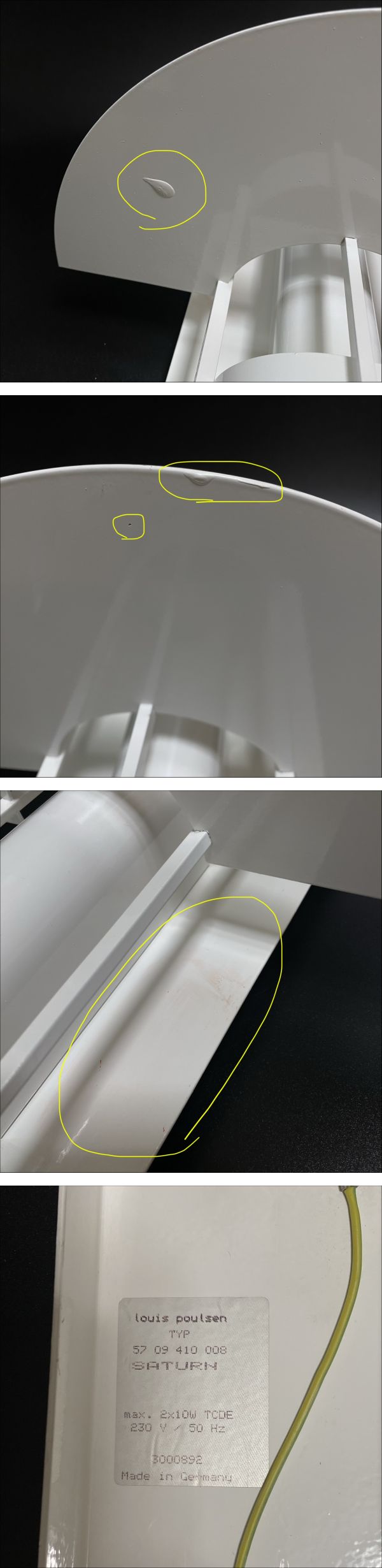 | ご覧いただきありがとうございます。 Joachim LepperがデザインしたLouis Poulsen製造の『Saturn』です。 本品は生産数が少なく、日本で流通することは少ない希少なモデルです。 間接照明として、ルイスポールセンらしく、光と陰のコントラストで お洒落な空間を演出するライトです。 ・目立ったキズは無く、概ねきキレイな状態です。 ・塗料の固まりは写真添付してますが、写真では分からない塗りムラもあります。 ・赤い塗料の付着があります。裏面にはっきり付着しています。 表面にはごく薄く付着しています(写真添付しています)。 ★電球ソケットは口金26に付け替えています。お好みの電球をお付けください(電球は付属しません)。 ★壁への取り付け、配線工事が必要です。専門業者にご依頼下さい。 【サイズ】 高さ 約34cm 奥行 約22cm 横幅(半円状) 31cm 重さ 約3㎏ | ||