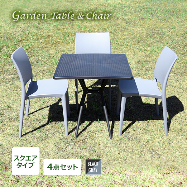 送料無料 プラスチックチェア ガーデンチェア ガーデンテーブル 4点セット UVカット ブラック×グレー スクエアテーブル 角型 3脚 軽量 收藏