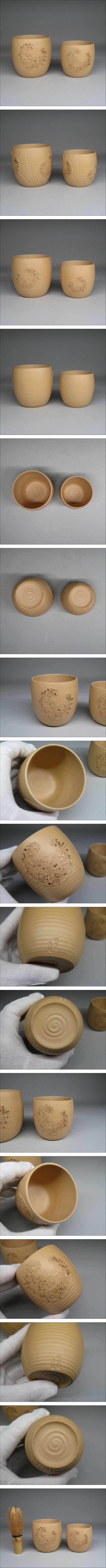 煎茶道具◆【秋田焼 道遊】奥田道遊 作 湯呑 2客 白泥 蛙蕗葉 細工//紫砂壷 茶壷 茶器 茶道具 寶瓶 宝瓶lot:22323