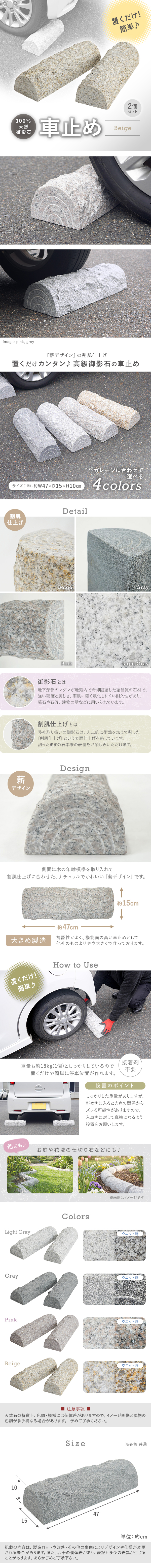 | 商品名 | 送料無料 車止め 高級みかげ石 薪デザイン タイヤ止め 車輪止め カーストップ 簡単置くだけ 簡単 設置 2本1組販売 2個 セット 駐車場 ガレージ 車庫 パーキング ストッパー ブロック タイプ おしゃれ 御影石 縁石 コンパクト コンクリート アスファルト カラー carstopg |