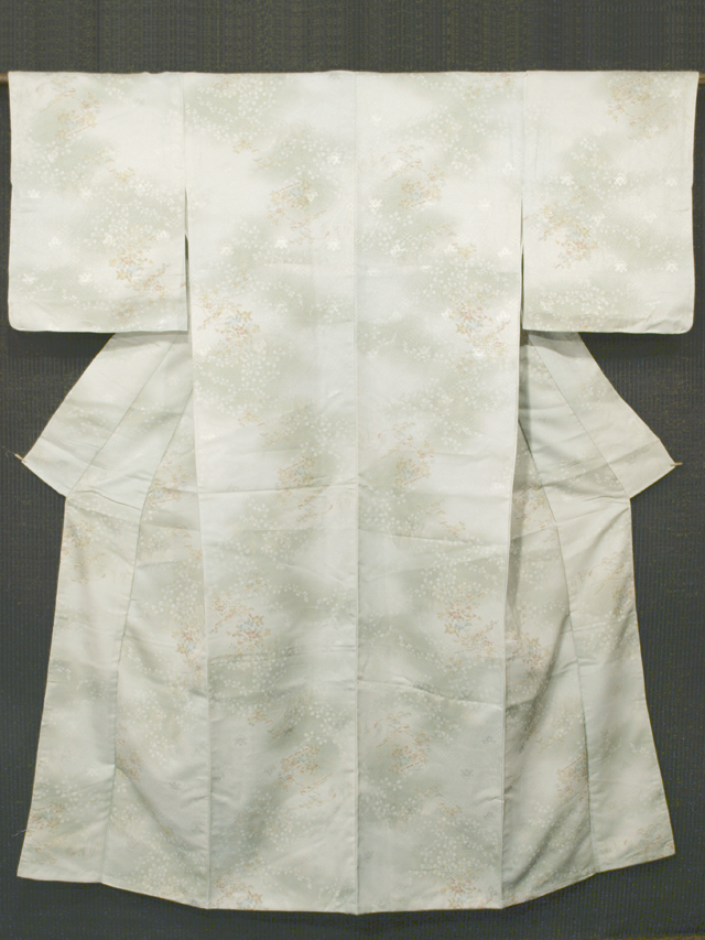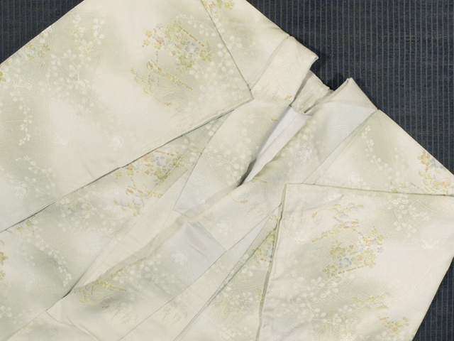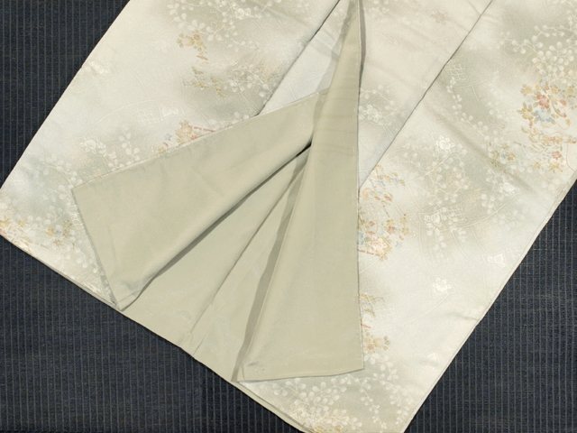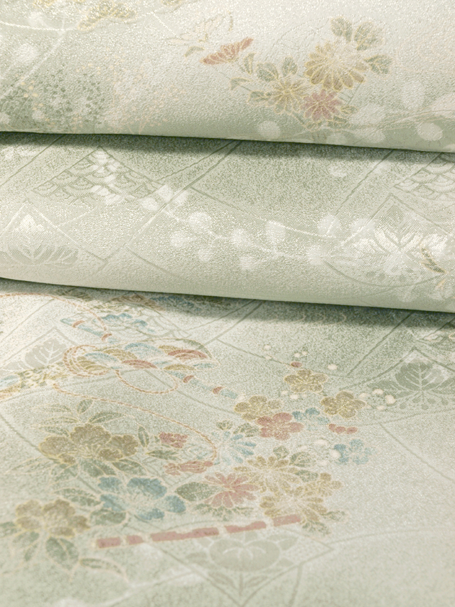 全体的な印象としては、濃淡のぼかしのある白緑(びゃくろく)色といった感じの地に、橘(たちばな)や桐、青海波などの小紋の配された地紙の地紋が織り出され、草花と龍笛の文様が染められている、綸子の洗える着物の小紋です。袷仕立てです。 おぼろげで、透明感の感じられる品の良い意匠です。とてもやわらかで、洗える着物とはあまり感じられない手ざわりの良さです。洗える着物は、お手入れが簡単なので 1 枚持っておくと重宝しますね。よく着物をお召しになられる方やお仕事で着物をお召しになられる方なら、なおさらです。 しつけ付きの仕立て上がり未使用保管品で、しみやよごれ、褪色などのダメージもありません。新品同様です。 |