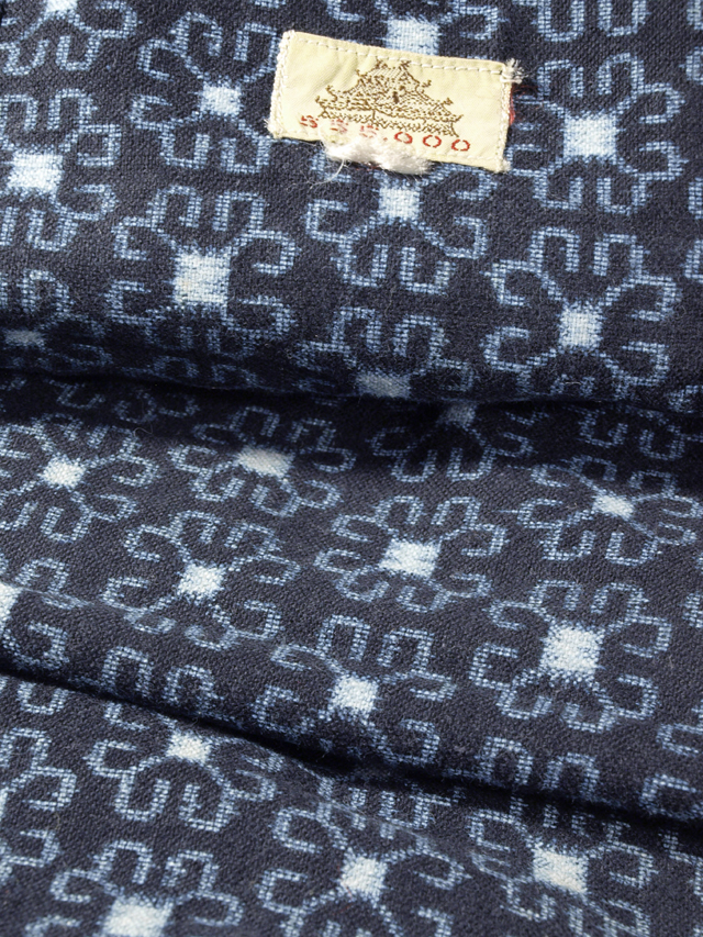 濃藍(こいあい)の地に、藍白色で絣調の唐花の文様が染められている、綿のもんぺです。 ほぼアンティークと言えるお品です。前ポケットがついており、日本の城があらわされたタブが縫い付いています。ベルトループなどはありません。 アンティーク品で、胴回りと裾にギャザーが施されていますが、おそらく内部のゴム紐が劣化しているようで、伸縮性はほぼありません。また、股の縫い合わせが約 3cm ほどほつれています。そのほかに目につくしみやよごれ、褪色などのダメージはなく、全体的にはきれいな状態ですが、状態ランク=「D」のご着用対象外、リメイク素材用とさせていただきます。 |