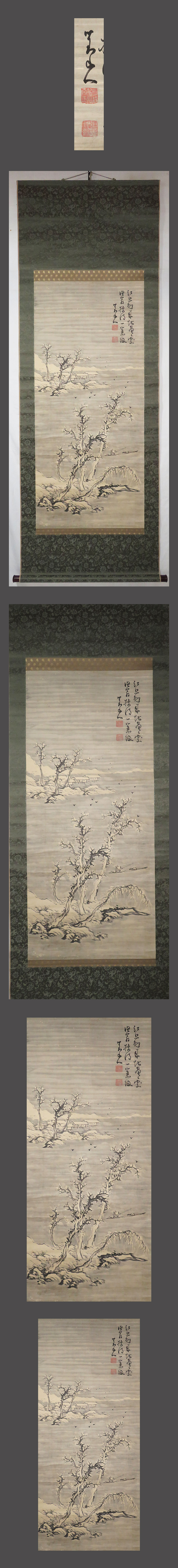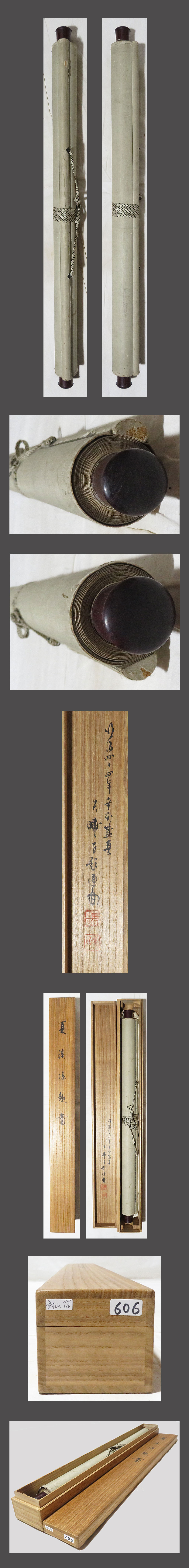 肉筆、真作保証。 作品に、時代感、シミ、汚れ、多数の折れ、 巻きじわ、多数のスレ、傷んでる箇所があります。 表装に、時代感、シミ、汚れ、折れ、巻きじわがあります。 表装裏側に、経年によるシミ、汚れ、スレ、傷んでる箇所があります。 箱は三宅呉暁の鑑定箱書きがあります。軸先があります。 日根対山 略歴:美術評価額350万、文人画、鉄翁に私淑、星巌・ 海屋と交遊、号芽海・錦林子、大阪、明治2年57才没。 三宅呉暁 略歴:美術評価額100万、文展褒状、京美教論、 師森川曽文、名清三郎、花鳥・山水、京都、大正8年56才没。 下記の真作保証について・注意事項をよくご覧の上、 お気に召された方に、お譲り致しますので、ご入札を宜しくお願い致します。 |