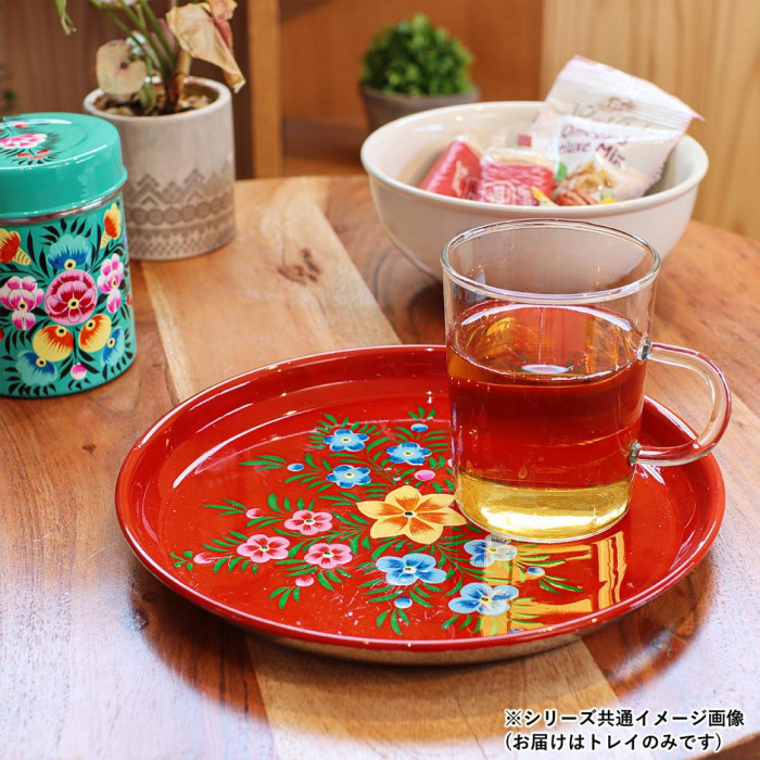 | 存在感ある色彩豊かなペイントのラウンドトレイ。小物やアクセサリー置きなど、お好みでいろいろな使い方ができるトレイです。カシミールペイントとは紙製の張子やステンレスに色鮮やかな色彩で植物や動物を描く、インド北部とパキスタン国境に位置するカシミール地方の伝統工芸です。 ※食器ではありませんので、食べ物を直接置くことはできません。 |