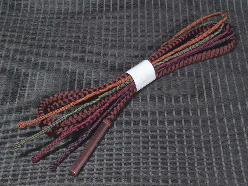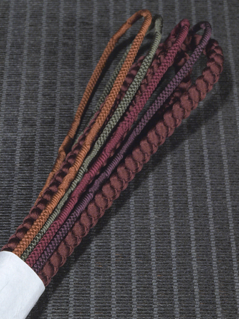 | 詳細 | 黒茶色無地の丸組(八つ組)から、老竹(おいたけ)色、濃紅(こきくれない)色、柿茶色の細丸組(八つ組)の 4 本先バラになっている、丸組の帯締めです。 ユーズド品としてはいますが、使用感は感じられません。しみやよごれ、褪色などのダメージは見あたらず、ほぼ新品同様にきれいな状態です。 |